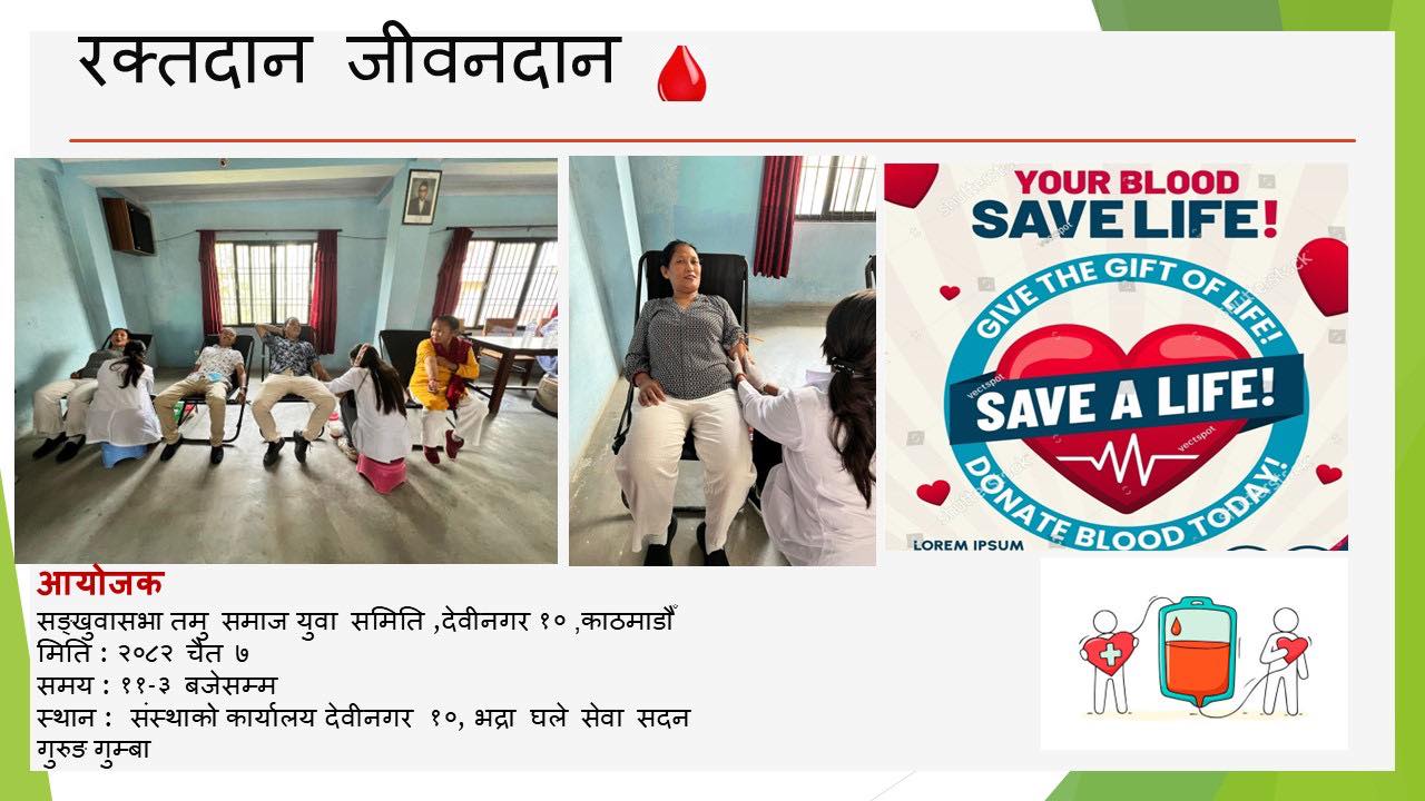 संखुवासभा तमु समाज सेवासमिति, काठमाडौंको उपसमिति तथा युवा समितिका अध्यक्ष श्री पूजा गुरुङज्यूको अध्यक्षतामा मिति २०८२ साल चैत्र ०७ गते, शनिबारका दिन संस्थाको कार्यालय देवीनगर–१०, बानेश्वरमा आयोजित रक्तदान कार्यक्रम सफलतापूर्वक सम्पन्न भएको छ।